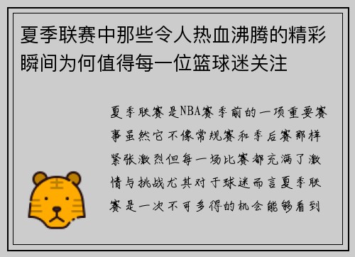 夏季联赛中那些令人热血沸腾的精彩瞬间为何值得每一位篮球迷关注